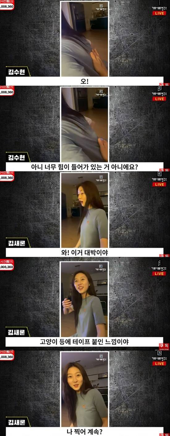 해당 영상에는 김새론이 김수현으로 추정되는 남자와 함께 집 데이트를 즐기는 듯한 모습이 담겨있다. 김새론이 등에 무언가를 붙인 듯 움찔거리더니 "이거 대박이다. 고양이 등에 테이프 붙인 느낌이다"고 말했다.