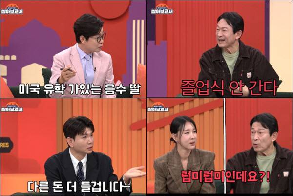 쇼츠 속 김응수는 연예계 대표 '딸바보'임에도 "딸 졸업식에 가기 싫다"고 돌발 선언한다. MC 김성주가 "따님이 미국에서 공부 중인데 졸업식은 가셔야 하지 않냐?"라고 묻자, "5월 14일에 졸업하는데, 전 안 갈 거다"라며 불참을 선언하는 것. 이에 MC 이지혜와 제이쓴은 "딸 졸업식에 아버지가 안 가면 어떡하냐?"며 대리 걱정을 하고, 그럼에도 김응수는 "비행기를 장시간 타는 게 싫다. 그래서 저는 안 가는 걸로 했다"고 단호하게 답한다. 김응수가 장거리 비행에 거부감을 드러낸 이유가 무엇인지, 그리고 어떤 '해외살이 로망'을 갖고 있을지에 궁금증이 모아진다.