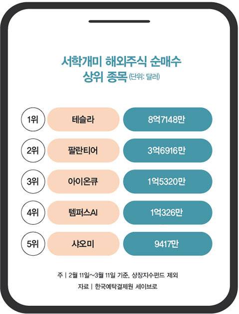 3월 12일 한국예탁결제원 증권정보포털 '세이브로'에 따르면 서학개미는 최근 한 달간(2월 11일~3월 11일) 템퍼스AI를 1억326만 달러(약 1500억7800만 원)어치 순매수했다(표 참조). 이 기간 템퍼스AI는 상장지수펀드(ETF)를 제외하고 서학개미가 순매수한 해외주식 4위에 올랐다. 지난달 (2월 1~28일)에는 테슬라와 '디렉시온 데일리 테슬라 2배 불 셰어즈 ETF(TSLL)'에 이어 서학개미가 순매수한 종목 3위에 오르기도 했다. 올해 34.25달러로 출발한 템퍼스AI 주가는 2월 14일(이하 현지 시간) 장중 91.45달러까지 올랐다가 3월 11일 현재 45달러(약 6만5000원)대에서 거래되고 있다.