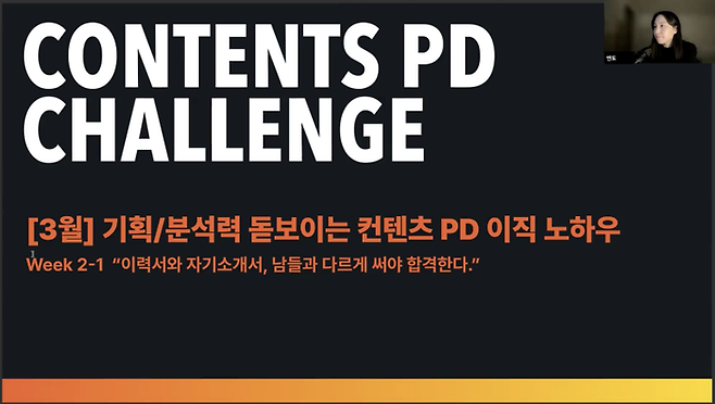 콘텐츠 PD 챌린지는 최근 주목받고 있는 콘텐츠 PD로의 성공적인 취업·이직을 위해 차별화된 포트폴리오 제작에 초점을 맞췄다. 콘텐츠 PD의 핵심 역량으로 꼽히는 콘텐츠 분석력과 기획력, 트렌드 인사이트를 명료하게 포트폴리오에 담는 것을 목표로, 2주에 걸친 세부 프로그램을 운영했다.