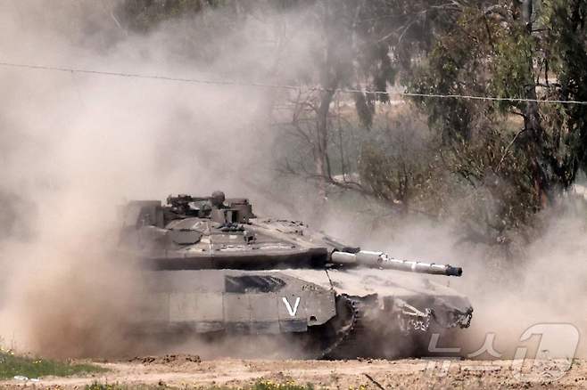 (가자 AFP=뉴스1) 우동명 기자 = 18일(현지시간) 이스라엘 군 탱크가 팔레스타인 가자 지구의 국경을 따라 이동을 하고 있다. 2025.03.19