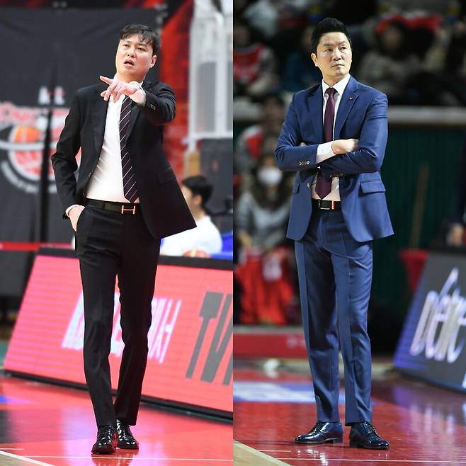 사진 설명 = 왼쪽부터 송영진 KT 감독-전희철 SK 감독