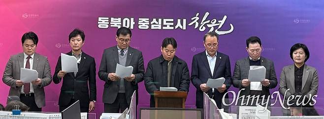 민주당 의원들은 "홍 시장은 시장이 된 이래로 전임시장 때리기, 흔적 지우기에만 골몰해 왔을 뿐 사실상 그외에는 어떤 일도 하지 않았다. 홍남표 시정이 단 하나라도 제대로 해결한 사업이 있는가. 대통령은 성질대로 안된다고 불법비상계엄을 선포하고, 100만 도시 시장은 제 마음에 안 든다고감사하고 징계하고 수사 의뢰하기를 반복하고 있다"라고 말했다.