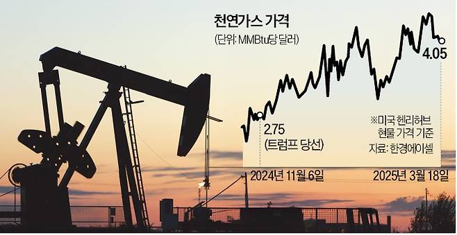 헨리허브 가격은 지난해 3월 1.7~1.8달러 수준에서 160% 가까이 급등했다. 트럼프 대통령의 당선 가능성이 높아진 지난해 8월부터 상승세가 본격화됐으며 당선일(11월 6일)에는 2.75달러까지 올랐다. 이후에도 꾸준히 상승해 최근 4달러 선을 유지하고 있다.