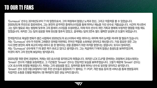 19일 T1은 조 마쉬 CEO 명의로 구마유시를 2025 LCK 정규 시즌 선발 라인업으로 기용해 달라고 요청했고, 이 요청이 받아들여저 구마유시가 주전 원거리 딜러로 정규 시즌을 시작할 것이라고 알렸다.