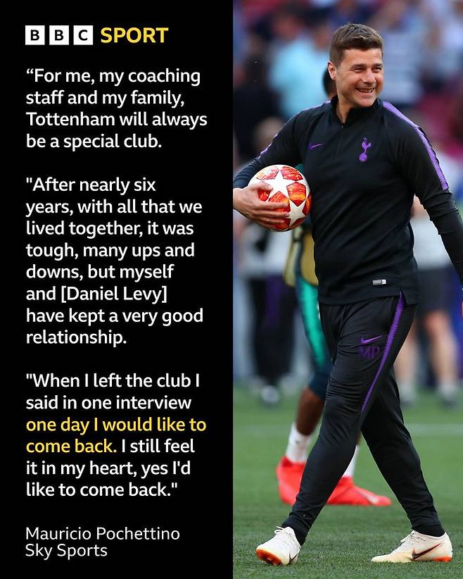 영국 매체 '스카이스포츠'는 19일(이하 한국시간) "포체티노가 토트넘으로 돌아오고 싶어 한다"고 보도, 그의 인터뷰를 인용하며 많은 팬을 놀라게 만들었다.