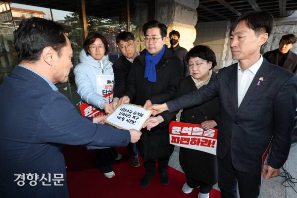 정혜경 진보당 의원(왼쪽부터), 최승현 기본소득당 최고위원, 박찬대 더불어민주당 원내대표, 김선민 조국혁신당 대표 권한대행, 한창민 사회민주당 대표가 19일 서울 종로구 헌법재판소에서 윤석열 대통령 파면 선고를 신속 촉구하는 서한문을 전달하고 있다.