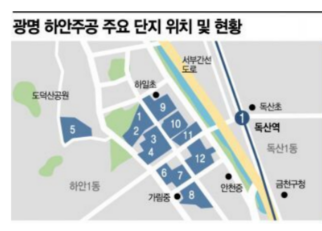 1980~1990년대 대규모 주택단지로 조성된 하안택지지구는 면적이 약 136만㎡다. 하안주공1~13단지 아파트로 구성돼 있고, 전체 규모만 2만2258가구에 달한다. 한국토지주택공사(LH)가 관리하는 13단지를 제외한 나머지 단지들은 모두 정밀안전진단을 통과했다.