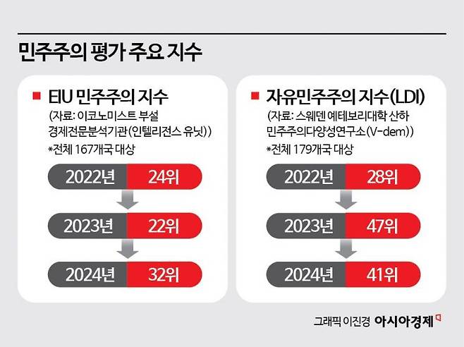 영국 이코노미스트 부설 경제전문분석기관(EIU·Economist Intelligence Unit)은 '2024 민주주의 지수' 발표를 통해 한국의 민주주의가 퇴보하고 있다는 평가를 내렸다. EIU 지수에서 한국은 총점 10점 만점 중 7.75점을 기록, 2006년 지수 산출 이래 가장 낮은 점수를 받았다. 순위도 22위(8.09점)를 기록했던 2023년보다 열 계단 하락한 32위를 기록했다. 이로 인해 한국은 8점 이상 국가가 속하는 '완전한(full) 민주주의'가 아닌 '결함 있는(flawed) 민주주의'에 속하게 됐다.