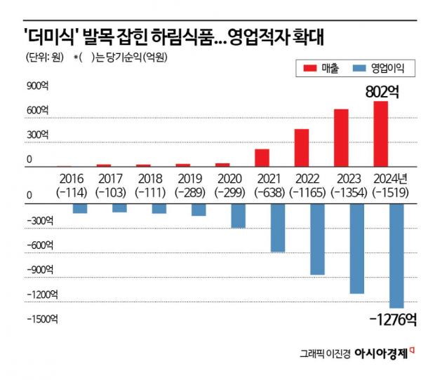 창사 이후 계속 적자 행진은 계속되고 있다. 하림산업이 감사보고서를 공개하기 시작한 2016년 116억원의 영업적자를 시작으로 매년 100억원이 넘는 적자를 기록했고, 하림식품과 합병한 2019년 이후 적자폭이 가파르게 늘었다. 특히 김 회장의 야심작으로 꼽히는 더미식 출시 이후 영업손실은 눈덩이처럼 불어나고 있다.