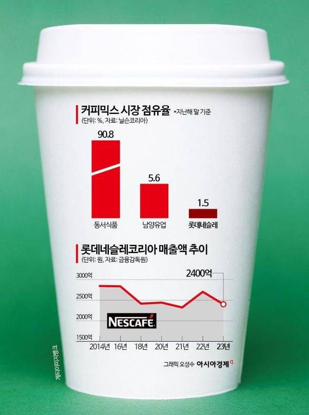 하지만 한국 시장에서 고전은 계속됐다. 시장조사업체 닐슨에 따르면 지난해 말 기준 커피믹스 시장 점유율은 동서식품이 90.8%로 독보적 1위다. 남양유업이 5.6%로 뒤를 이었으며, 롯데네슬레는 1.5%에 불과했다. 인스턴트커피도 동서식품(75%), 네슬레(19.1%), 남양유업(0.1%) 순이었다.