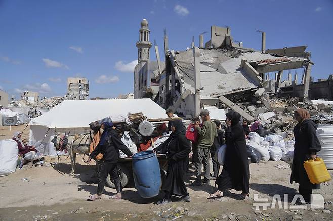 [자발리아=AP/뉴시스] 19일(현지 시간) 이스라엘군이 가자지구에 대한 공격을 재개해 피란길에 나선 팔레스타인 주민들이 소지품을 들고 베이트하눈에서 자발리아로 이동하고 있다. 2025.03.20.