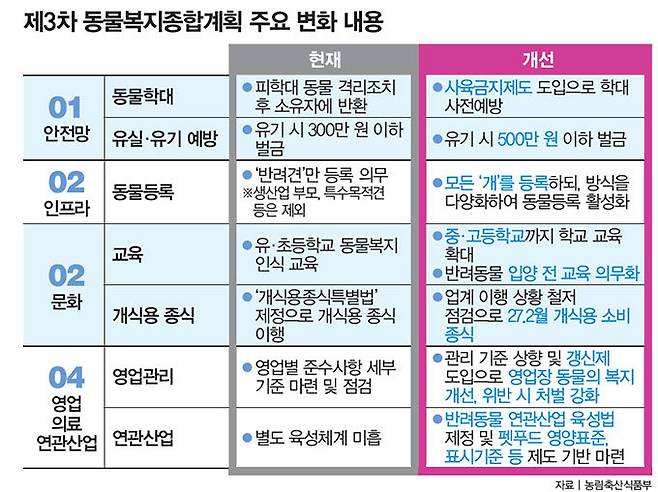 이번에 발표된 계획은 2015~2019년, 2020~2024년에 이어 마련된 제3차 동물복지종합계획입니다. 제3차 동물복지종합계획의 비전은 "사람과 동물이 다 함께 행복한 동물복지 선진국"입니다. 정책 패러다임을 동물 '보호'에서 적극적인 '복지' 체계로 전환하고, 학대·유기 예방 및 책임감 있는 반려동물 돌봄 문화를 만들겠다는 게 정부 목표입니다. 구체적으로 ①동물복지 안전망 강화 ②인프라 확충 ③반려문화 확산 ④동물영업 및 의료체계 개선, 연관산업 육성 등 4개 분야에 20개 세부 과제가 포함됐습니다(표 참조).