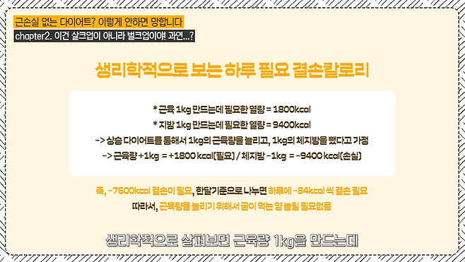 그래도 '근육량 늘리려면 많이 먹어야 되지 않나'라고 말씀하시는 분들을 위해서 좀 더 추가로 설명해 보자면, 생리학적으로 살펴봤을 때 근육량 1kg을 만드는 데 필요한 칼로리는 1,800kcal 정도고 지방 1kg을 만드는 데 필요한 열량은 9,400kcal 정도입니다. 이로 미뤄봤을 때 우리가 운동 강도를 잘 뽑아서 상승 다이어트로 체지방을 1kg 빼고 근육량을 1kg 늘렸다면 오히려 7,600kcal의 결손이 필요해서 한 달 기준으로 나누면 하루에 오히려 84kcal 적게 먹어야 합니다. 하지만 실제로는 늘릴 수 있는 근육량은 더 적고 빼야 하는 체지방은 더 많죠. 그래서 여러분들이 결손 칼로리를 더 많이 잡으시는 게 맞아요. 따라서 근육량을 늘리기 위해서 굳이 먹는 양을 늘릴 필요 없습니다.