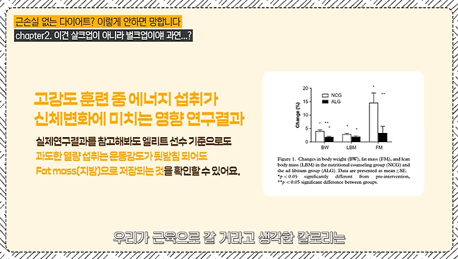 우리가 근육으로 갈 거라고 생각한 칼로리는 연구 결과에 따르면 체지방으로 전환되는 것을 확인할 수 있습니다. 과도한 열량 섭취는 운동 강도가 뒷받침되어도 지방으로 저장되는 걸 확인할 수 있어요. 남성분들의 경우에는 예외가 있을 수 있지만 여성분들의 기준으로 했을 때는 근육량을 늘리면서 다이어트를 해도 크게 추가 칼로리 섭취가 필요하지 않습니다.