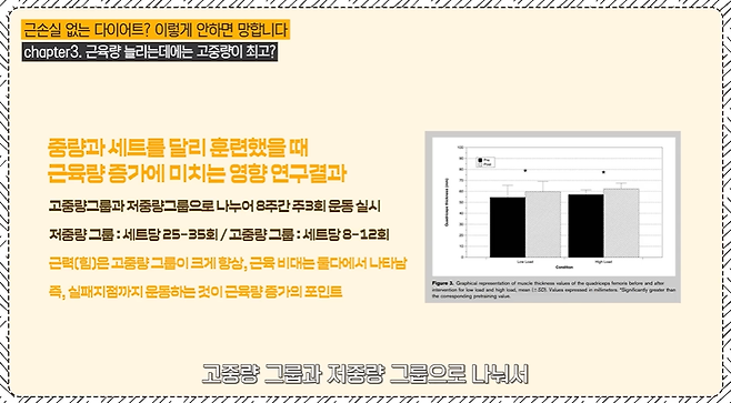 '아 그래도 무게를 들어야 하는 거 아니야?'라고 말씀하시는 분들을 위해서 설명을 드릴게요. 고중량 그룹과 저중량 그룹으로 나눠서 8주간 주 3회 운동을 한 실제 연구 결과, 저중량으로 세트당 25~35회 운동한 그룹과 고중량으로 세트당 8~12회 훈련한 그룹을 비교했을 때 근력 무게를 들어 올리는 힘은 고중량 그룹에서 크게 향상되었지만, 근육의 크기가 증가하는 비대는 둘 다 나타났어요. 우리는 힘이 세지고 싶은 게 아니라 예쁜 몸을 만들고 싶은 거잖아요. 결국 고중량, 저중량을 나누는 것이 아니라 실패 지점까지 운동하는 것이 포인트라는 거예요.