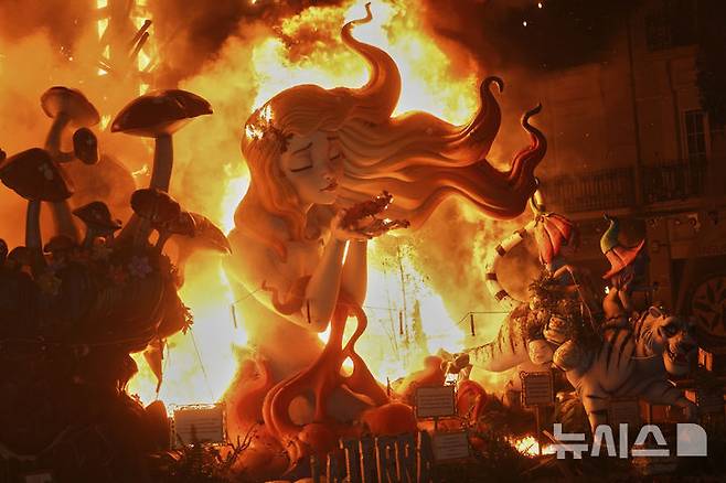 [발렌시아=AP/뉴시스] 19일(현지 시간) 스페인 발렌시아에서 라스 파야스 축제가 열려 '니놋'(Ninots)으로 불리는 종이 인형이 불타고 있다. 치명적인 홍수가 강타한 지 5개월 만에 발렌시아에서 최대 연례행사인 파야스 축제가 열렸다. 대형 종이 인형들은 홍수 피해 주민들의 집 잔해를 활용해 제작됐으며, 재난에 부실하게 대응했다는 비판을 받은 정치인과 각국 지도자들을 풍자하고 있다. 2025.03.20.