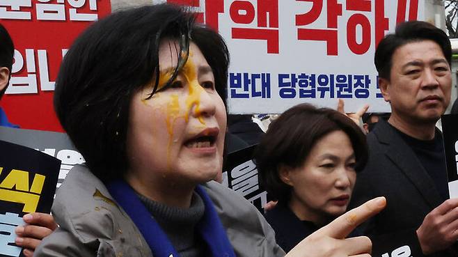 백혜련 의원과 이건태 의원은 오늘 오전 헌재 앞에서 윤석열 대통령의 신속한 파면을 촉구하는 회견 도중 건너편 인도에서 날아온 날계란을 맞았습니다.