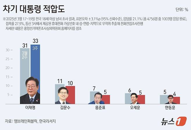(서울=뉴스1) 김초희 디자이너 = 엠브레인퍼블릭·케이스탯리서치·코리아리서치·한국리서치가 지난 17일부터 19일까지 전국 만 18세 이상 남녀 1003명을 대상으로 한 전국지표조사(NBS)에 따르면, 차기 대통령감으로 가장 적합한 인물이 ‘이재명’이라는 응답이 33%로 가장 높았다. 그다음으로 김문수 10%, 홍준표·오세훈 5%, 한동훈 4% 등이 그 뒤를 이었다.