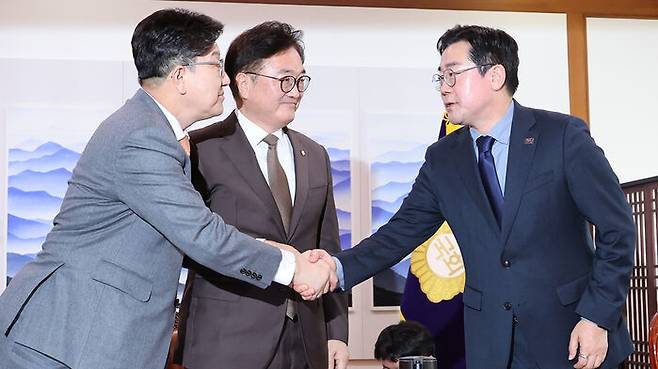 ▲ 우원식 국회의장과 국민의힘 권성동 원내대표(왼쪽), 더불어민주당 박찬대 원내대표(오른쪽)가 20일 서울 여의도 국회의장실에서 국민연금 개혁안에 합의한 뒤 악수하고 있다.