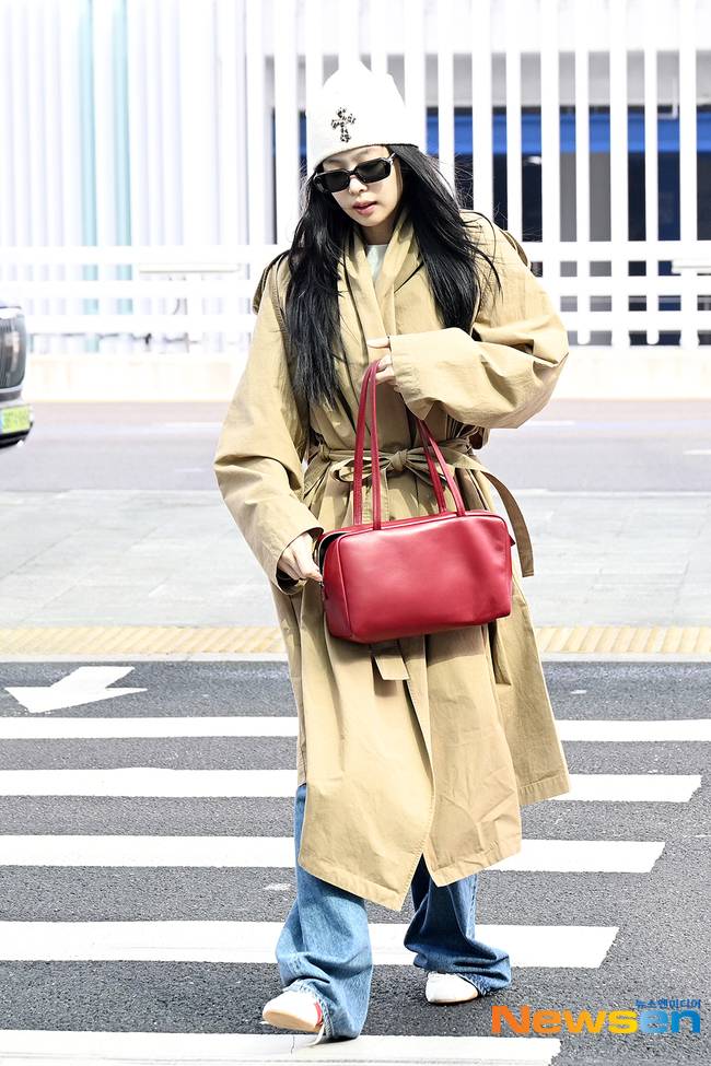 이날 제니는 오버핏 트렌치 코트에 스니커즈를 덮을 정도로 길게 내려오는 청바지를 착용했다. 빨간색 가방을 들고 하얀색 비니에 네오 선글라스로 포인트를 줬다.
