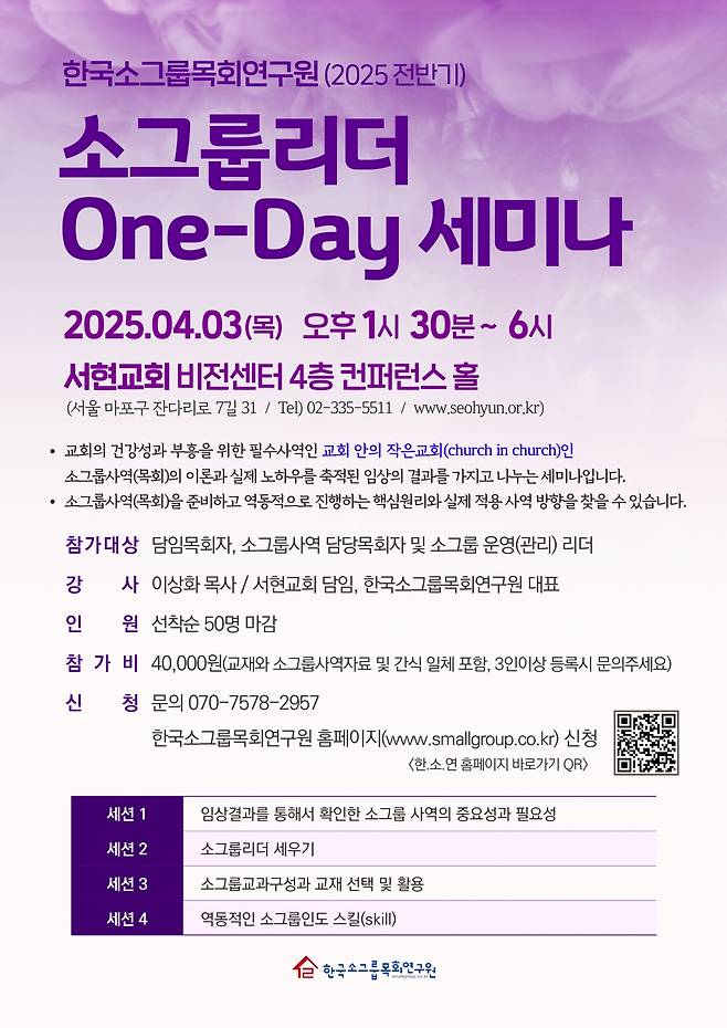 한국소그룹목회연구원(대표 이상화 목사)이 다음 달 3일 ‘소그룹리더 원데이 세미나(포스터)’를 개최한다고 20일 밝혔다.
