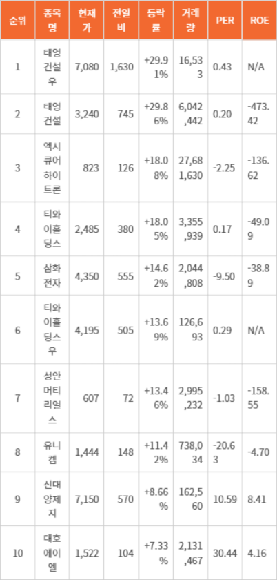 티와이홀딩스(363280)는 +18.05%의 등락률을 보이며 2,485원을 기록했고, 삼화전자(011230)는 +14.62%의 상승률로 4,350원에 거래를 마쳤다.