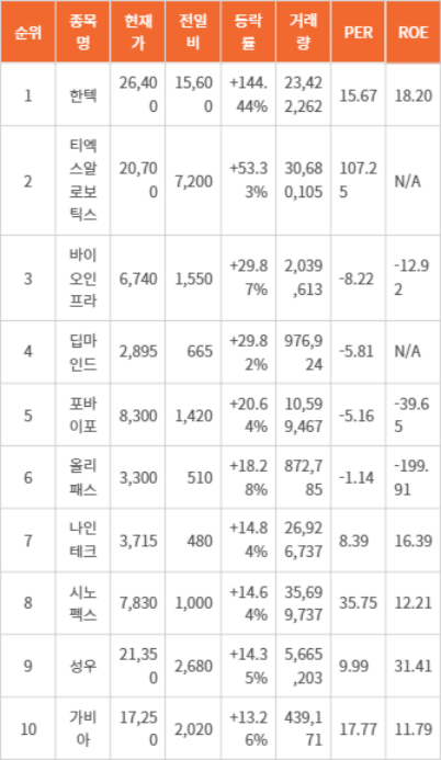 올리패스(244460)는 등락률 18.28%로 현재 3,300원이었다. 나인테크(267320)는 등락률 14.84%로 현재가는 3,715원이었다. 시노펙스(025320)는 등락률 14.64%로 현재 7,830원을 기록했다. 성우(458650)는 등락률 14.35%로 현재가는 21,350원이었다. 가비아(079940)는 등락률 13.26%로 현재 17,250원을 기록했다.