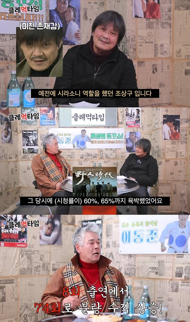 이에 조상구는 "1부에서 안재모 씨가 할 때 시청률이 오십몇 퍼센트까지 나왔다. 내가 투입된 건 2부. 다들 나이가 바뀔 때 시라소니라는 인물이 새로 등장했다. 그때 시청률이 뚝 떨어졌다"고 덧붙여 웃음을 자아냈다.