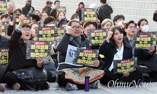 | ▲ 민변, 윤석열 즉각 파면 촉구 민주사회를 위한 변호사모임(민변) 주최로 20일 오후 서울 종로구 광화문 동십자각 무대에서 열린 "윤석열 즉각 파면 촉구 변호사대회-주권자 시민의 최후변론: 피청구인 윤석열을 파면한다"에서 참석자들이 헌법재판소 즉각 파면 결정을 촉구하고 있다. |