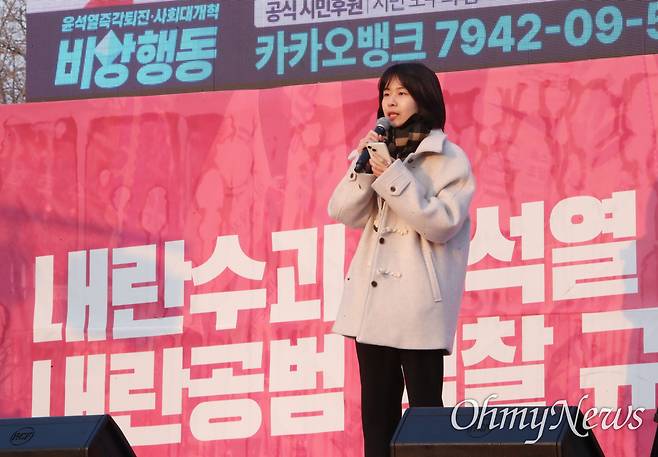 | ▲ 민변, 윤석열 즉각 파면 촉구 민주사회를 위한 변호사모임(민변) 주최로 20일 오후 서울 종로구 광화문 동십자각 무대에서 열린 "윤석열 즉각 파면 촉구 변호사대회-주권자 시민의 최후변론: 피청구인 윤석열을 파면한다"에서 최새얀 변호사가 최후변론을 하고 있다. |