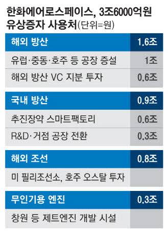 유상증자로 조달하는 3조6000억원 중 절반에 조금 못 미치는 1조6000억원이 K9 자주포·K239 천무 등 지상 방산 부문의 현지 공장 설립에 투입될 예정이다. 한화에어로스페이스는 "유럽과 중동 등에서 단순 무기 구매보다는 현지 생산 투자를 조건으로 한 협력 모델을 선호하고 있다"면서 "현지 생산 거점 확보로 적극 대응할 계획"이라고 설명했다.