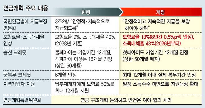 국민연금 보험료율과 소득대체율 인상 등이 담긴 국민연금법 개정안이 20일 국회 본회의를 통과해 18년 만에 연금개혁이 이뤄졌다. 보험료율은 27년 만에 현행 9%에서 13%까지 오르고, 소득대체율(연금 가입 기간 평균소득 대비 연금수령액 비율)은 40%(2028년 기준)에서 43%로 늘어난다. 이번 연금개혁에 따른 변화와 과제를 문답(Q&A) 형식으로 정리했다.
