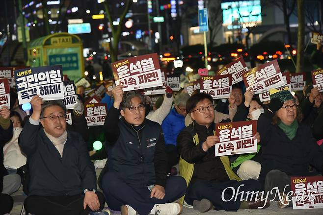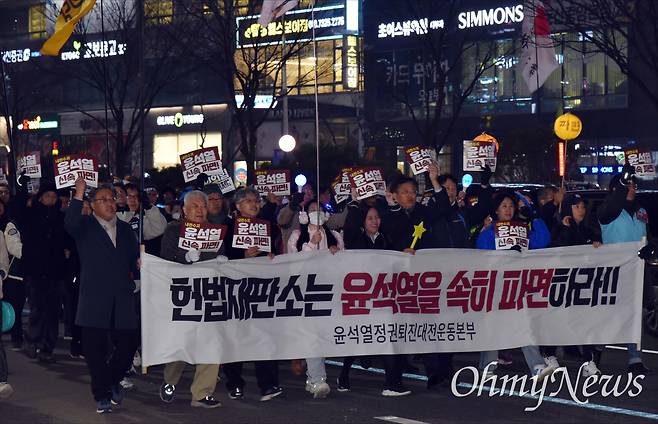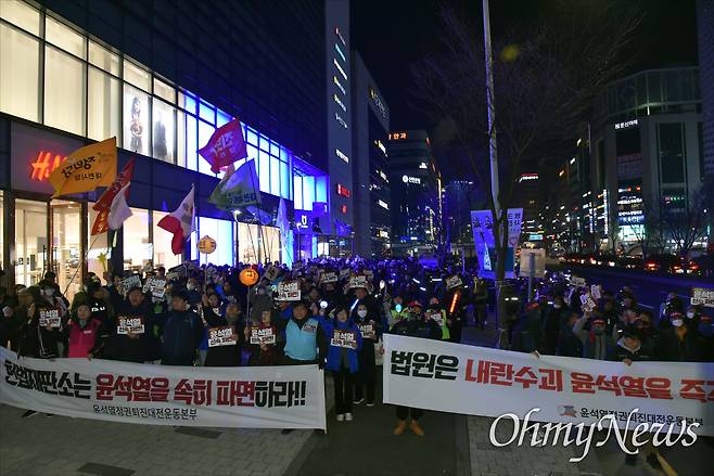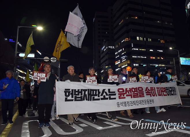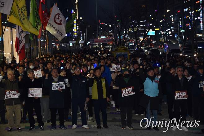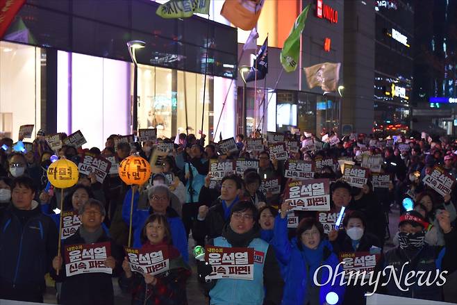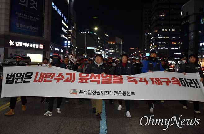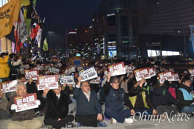 | ▲ 윤석열정권퇴진대전운동본부는 20일 저녁 대전 서구 둔산동 은하수네거리에서 '내란수괴 윤석열 즉각 파면! 즉시 재구속! 36차 대전시민대회'를 개최했다. |
