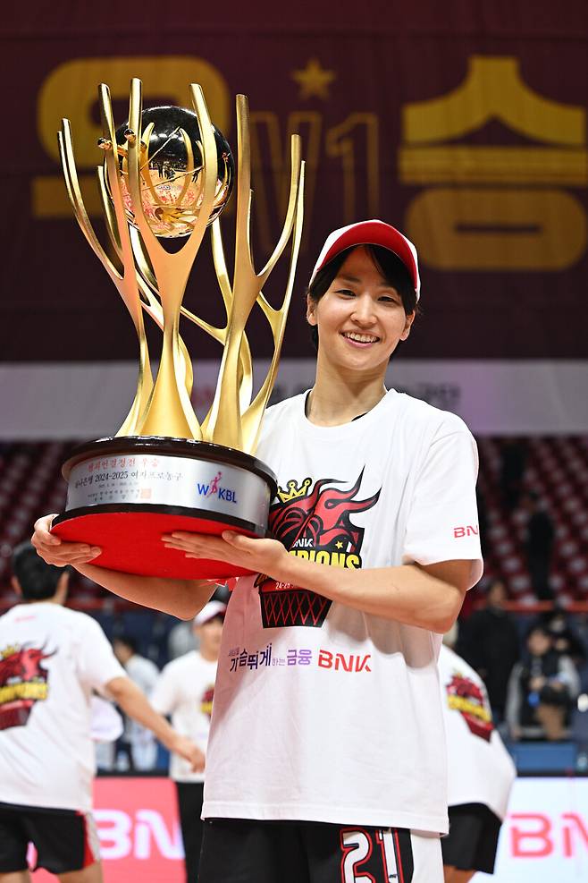 사키는 BNK 내에서도 박혜진에 이어 두 번째로 나이가 많은 베테랑이지만, 학창 시절을 포함해 이번이 첫 우승이다. 사키는 “너무 행복하다. 일본과 다른 환경에서 농구를 경험할 수 있어서 뜻 깊은 시즌이었는데 좋은 결과까지 얻어서 기쁘다”라고 소감을 전했다.