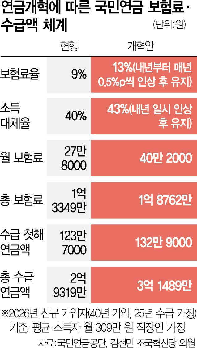 올해 3차 개혁에 따라 가입자들이 평균적으로 추가 부담해야 하는 액수는 월 12만 원 수준으로 예상된다. 여야가 국민연금 재정의 지속 가능성과 소득 보장성을 두루 감안하면서 받는 돈도 월평균 9만 원 늘어나게 된다. 다만 이번 모수 개혁(보험료·소득대체율 조정)은 국민연금 기금의 적자 전환 시점과 고갈 시점을 각각 7년과 9년 늦추면서 일단 급한 불을 끄는 것에 불과할 뿐 자동조정장치 등을 포함한 조속한 구조 개혁으로 이어져야 한다는 게 연금 전문가들의 조언이다.