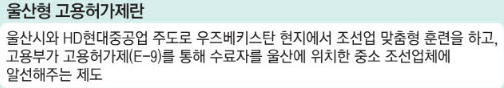 김두겸 울산시장은 “전국에서 처음 시도하는 사업인 만큼 좋은 결과를 내야 한다는 부담감이 크다”며 “한국 파견 인력의 우리 사회 적응을 위해 우즈베크 정부가 신변을 보증하고 관리할 수 있는 방안 마련의 필요성을 강조했다”고 말했다.