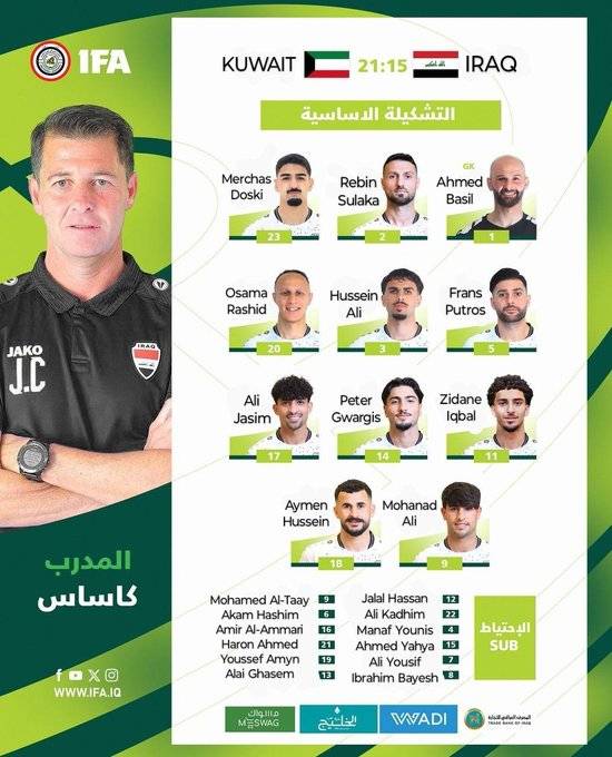 이라크는 같은 날 이라크 바스라에 위치한 바스라 국제경기장에서 열린 북중미 월드컵 아시아 예선 B조 7차전서 쿠웨이트에 2-2로 비겼다.