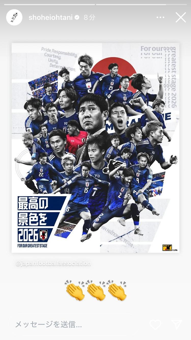 일본이 월드컵 본선 진출을 확정하자, 자국에서 가장 인기 있는 스포츠 스타 오타니도 반응했다. 야구 역사상 최고의 선수라고 불리는 오타니는 개인 소셜네트워크서비스(SNS) 스토리로 일본 대표팀의 본선 진출 소식과 함께 박수 이모티콘을 덧붙였다. 시즌이 이제 막 시작되어 현장에서 응원하진 못했지만, 자국 스포츠를 빛낸 축구 스타들에게 힘을 불어넣었다.