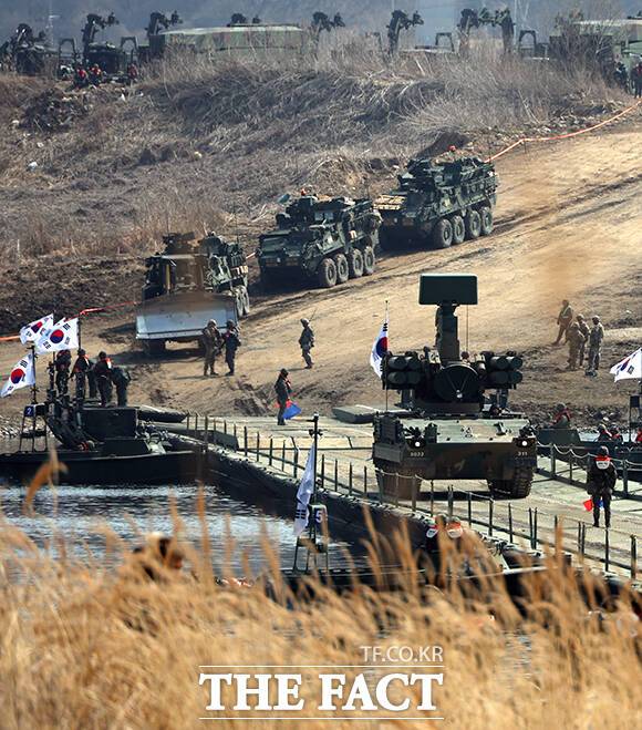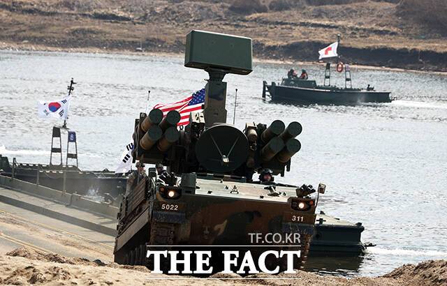 [더팩트ㅣ사진공동취재단] 한미 연합 제병협동 도하훈련이 20일 경기 연천군 임진강 일대 석은소 훈련장에서 열린 가운데 대공무기 천마가 연합부교를 건너고 있다.