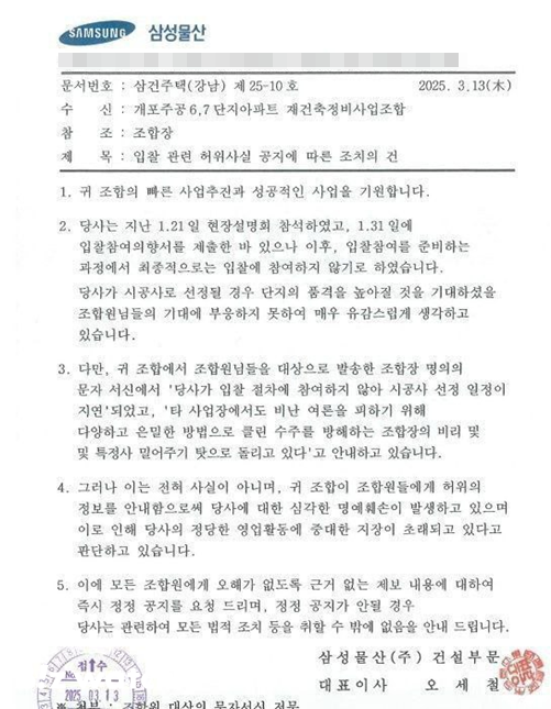 지난 13일 개포주공 6·7단지 재건축조합에 삼성물산이 보낸 공문 하나가 도착했어요. 성공적인 사업을 기원한다는 인사말로 시작된 공문은 "조합원에게 오해가 없도록 근거 없는 제보 내용에 대해 즉시 정정 공지 요청을 드린다"면서 "정정 공지가 안될 경우 모든 법적 조치 등을 취할 수밖에 없다"는 내용으로 끝났어요.