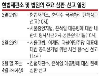 헌법재판소가 한덕수 국무총리 탄핵심판 선고기일을 오는 24일 오전 진행하기로 하면서 윤석열 대통령 탄핵심판 선고가 일러야 다음 주 후반, 늦어지면 4월 초까지 미뤄질 수도 있다는 관측이 나온다. 한 총리 선고에 이어 26일 이재명 더불어민주당 대표의 선거법 항소심 선고가 예정돼 주 후반 윤 대통령 선고까지 나오면 윤 대통령과 이 대표에겐 ‘운명의 한 주’가 불가피할 전망이다.