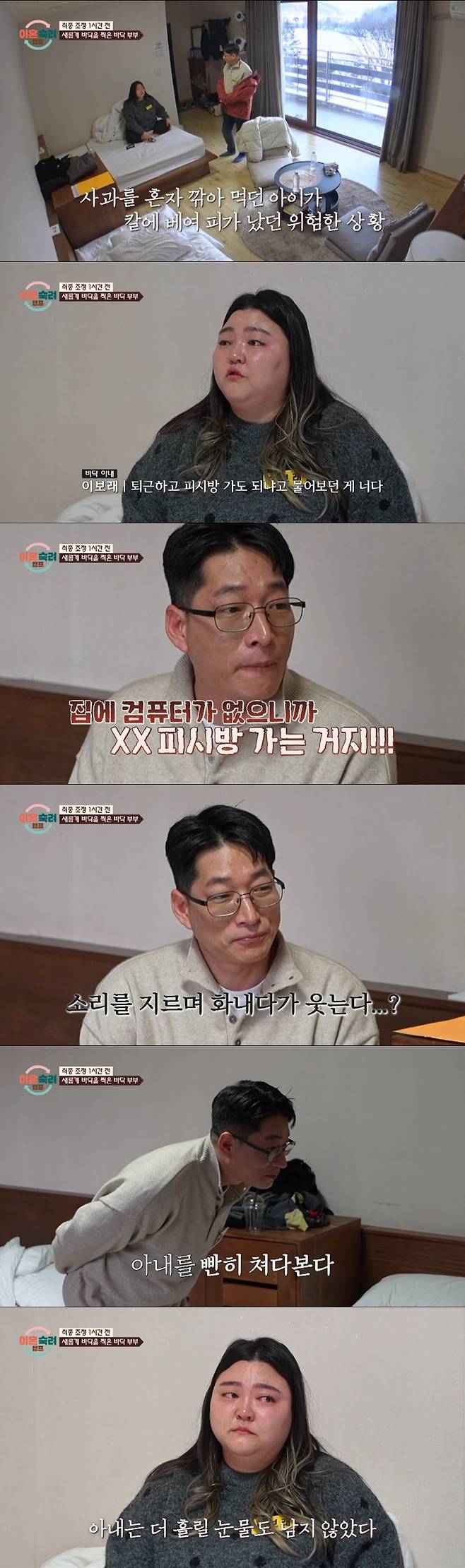 아내는 "애가 다쳐서 전화했을 때도 왜 너는 연락이 안되냐고 얘기했지 않냐. 나는 붕어빵 팔고 있었는데, 넌 게임하면서 시시덕거리고 있을 때 애가 사과를 혼자 깎아 먹다가 칼에 손을 베어서 전화를 했었는데 안 받지 않았냐. 애는 '엄마 피 많이 났어' 그러고 있는데, 난 발 동동 구르면서 기분이 어땠는지 아냐. 전화 다 무시하면서 게임하고 있었으면서"라고 말하며 눈물을 흘렸다.