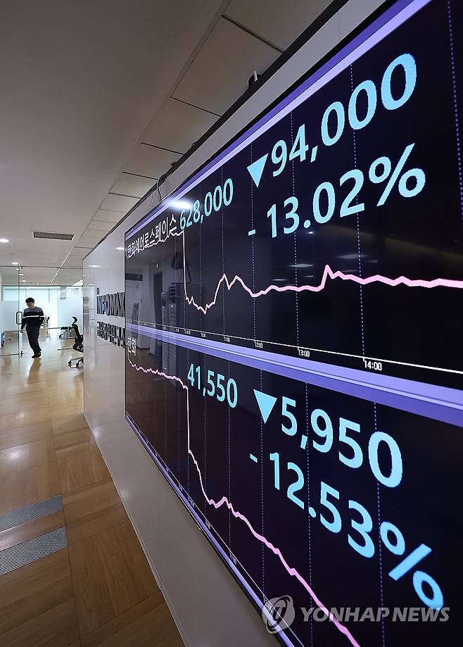 (서울=연합뉴스) 서대연 기자 = 한화에어로스페이스의 대규모 유상증자 결정에 한화그룹주가 동반 급락한 21일 서울 종로구 연합인포맥스 화면에 한화와 한화에어로스페이스 주가가 표시돼 있다.