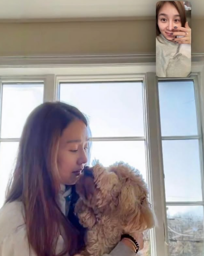 공개된 사진 속 이진은 넓은 창문을 등지고 있으며 한 팔에 반려견을 안은 채로 영상통화를 하고 있다. 화면 상단에 자리하고 있는 옥주현의 얼굴이 눈길을 끈다.