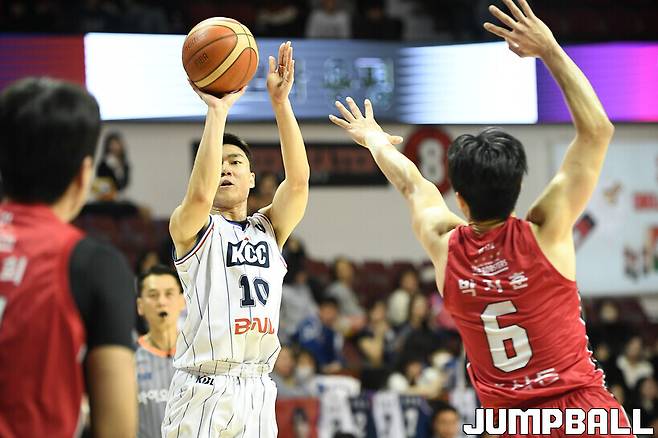 [점프볼=안양/유용우 기자] 21일 안양 정관장 아레나에서 열린 2024-2025 KCC 프로농구 안양 정관장과 부산 KCC의 경기, KCC 이주영이 3점슛을 던지고 있다.