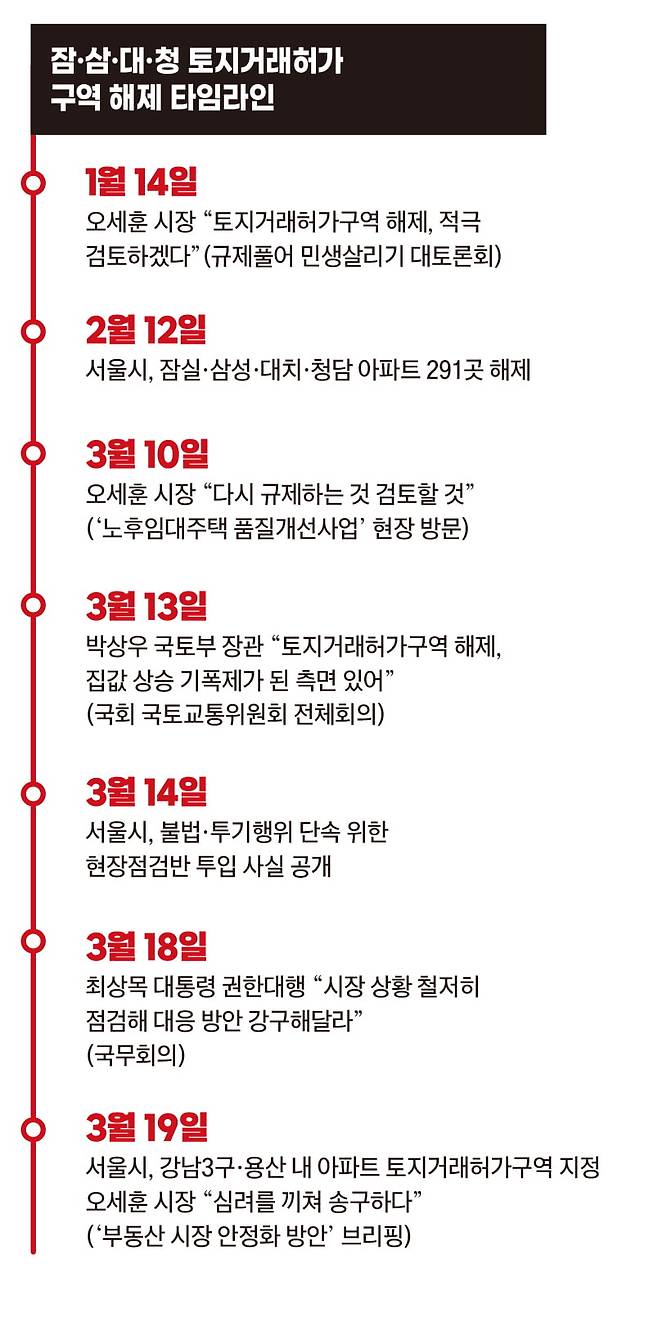 당황한 정부와 서울시는 즉각 진화에 나섰다. 지정 해제 당사자인 오 시장은 3월 10일 노후 공공임대주택 품질개선 단지를 방문한 현장에서 “약간의 가격 상승은 예상했다”면서도 “집값 상승이 과도하면 다시 규제하는 것도 검토하겠다”고 말했다. 사흘 뒤 박상우 국토교통부 장관이 “토지거래허가구역 해제가 집값 상승 기폭제가 된 측면이 있다”고 발언하며 오 시장을 직격했다. 사태가 이렇게 되자 서울시도 현장 단속에 나섰다. ‘설마’라는 일각의 반응에도 강남권 토지거래허가구역 재지정은 점차 기정사실화하기 시작했다.