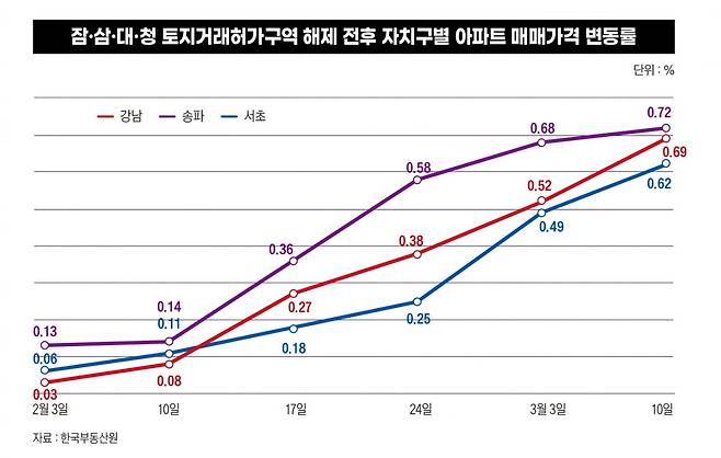 지정 해제 구역이 포함된 송파구와 강남구의 아파트 가격이 가장 가파르게 올랐다. 이 기간 송파구는 0.72%로 서울시 내 자치구 중 가장 큰 오름폭을 기록했고 강남구와 서초구가 각각 0.69%, 0.62%로 그 뒤를 이었다. 이는 7년 만에 가장 크게 상승한 것이었다. 이런 속도는 연간으로 환산하면 40~50% 상승이 가능한 수준이다.