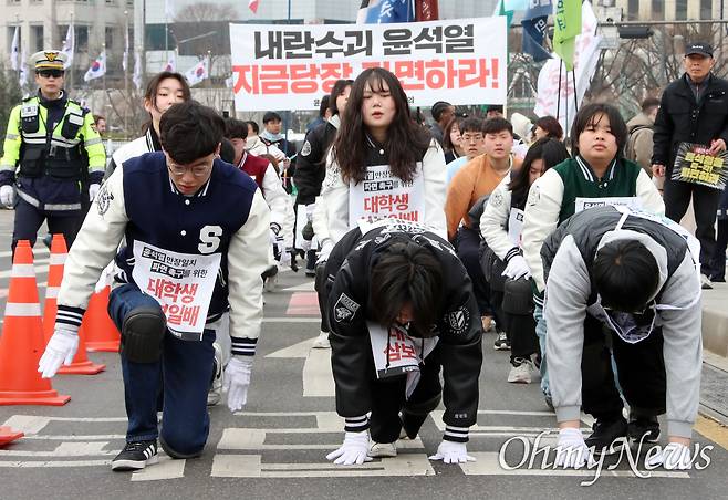 | ▲ 윤석열 만장일치 파면촉구 대학생 삼보일배 윤석열퇴진 전국대학생 시국회의 주최로 20일 오전 서울 종로구 경복궁 서십자각 터에서 헌법재판소까지 진행된 '윤석열 만장일치 파면촉구를 위한 대학생 삼보일배'에서 대학생들이 삼보일배를 하고 있다. |
