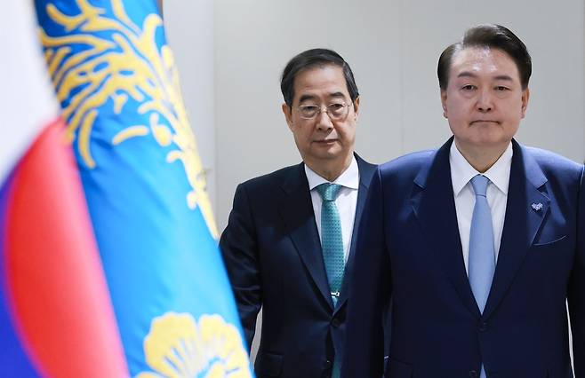 | ▲ 파면이냐 복귀냐는 결론을 넘어, 한덕수 총리 탄핵심판은 깊이 들여다보면 불안정한 헌정 상황과 매우 밀접하게 엉커있다. 사진은 지난해 3월 윤석열 대통령과 한덕수 국무총리가 국무회의에 입장하는 모습이다. |